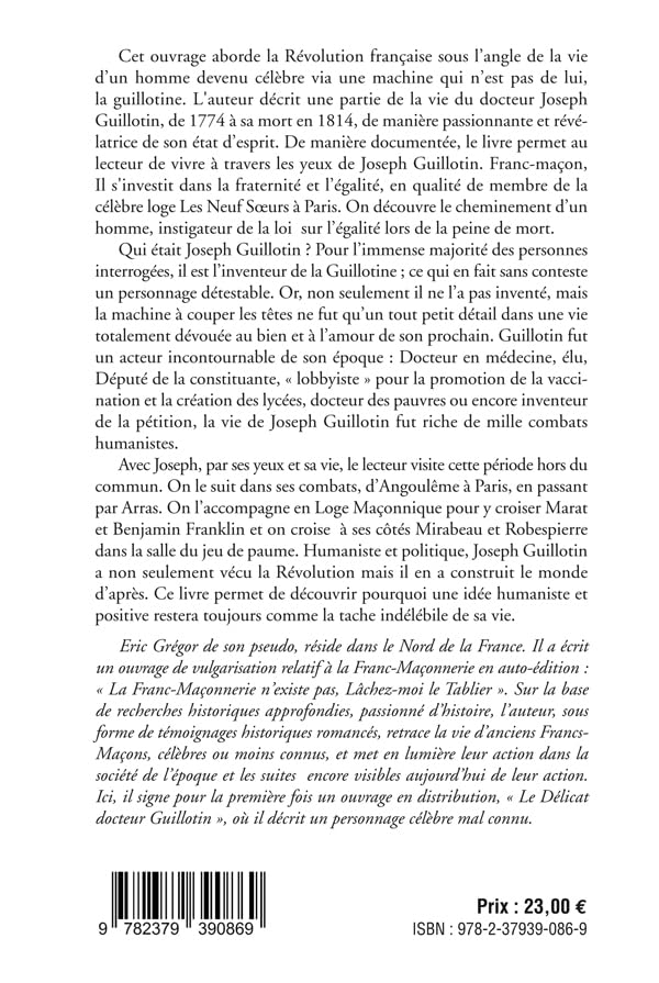 Longtemps réduit à une simple lame, son nom associé à la mort plus qu’à la vie, Joseph-Ignace Guillotin a disparu des mémoires derrière l’ombre de la guillotine. Dans ce roman engagé, Éric Grégor redonne une voix et une profondeur à cet homme bien réel, trop souvent caricaturé, voire oublié.
