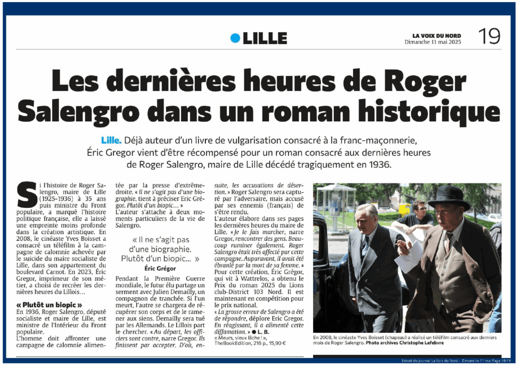 Le journal La Voix du Nord revient sur la parution du roman Meurs, vieux lâche !, signé Éric Grégor, qui retrace les ultimes jours de Roger Salengro, maire de Lille et figure marquante du Front populaire, tragiquement disparu en 1936.
